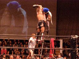 鳥羽がコーナーに上る、高木も上ってラダー上の争い、MIKAMIがトップロープから飛びついてのフェースクラッシャー風に高木を落とす(右写真)。