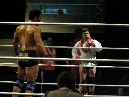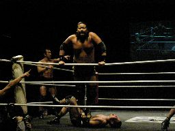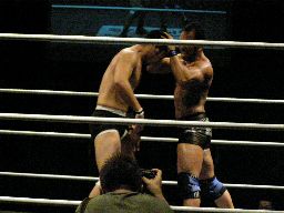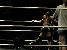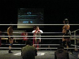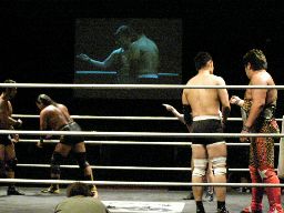 もう一発相打ち(右写真)、3発目で坂井がねじ伏せる。坂井は正美にタッチ。会場中から「え〜」「早い!」の声が飛ぶが坂井は「いいとこ!いいとこ!」