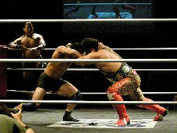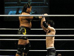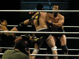 大鷲ヘッドロック、正美がロープに振ろうとするが大鷲振らせない(右写真)。二度目のトライもブロックしてグラウンドヘッドロックに。