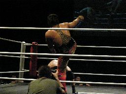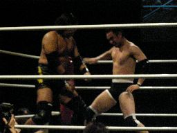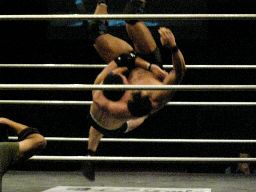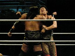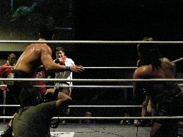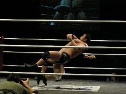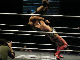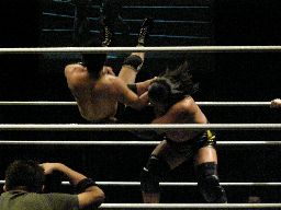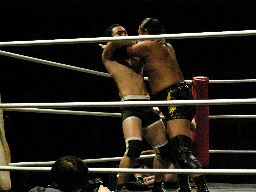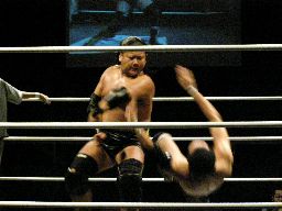 ダブルでロープに振ってクォーラルボンバーと延髄蹴りのサンドイッチ(右写真)、カウント2。