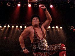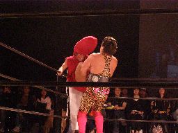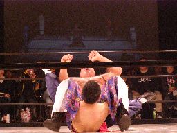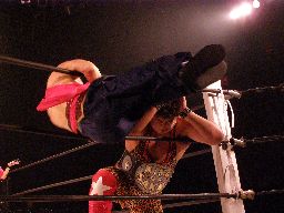 坂井が捕まえてコーナーに振って突っ込む、趙雲かわしてコーナーから619(右写真)、コーナーに上ってダイビングフットスタンプ、カウント2。