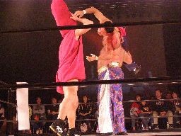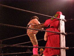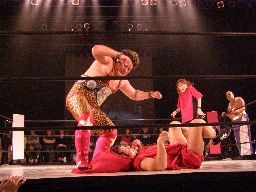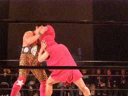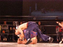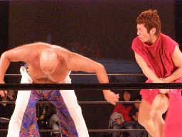 坂井ヘッドロック、的確にたらこマンの頭部を絞り上げる(右写真)。たらこマンロープに振る、坂井ショルダーブロックで吹っ飛ばす。