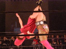 アルゼンチンバックブリーカーを回転エビ固めに切り返す(右写真)、カウント2。