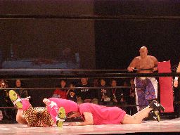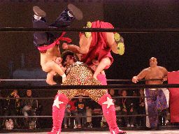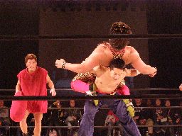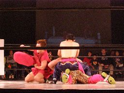 趙雲とたらこマンはダブルのブレーンバスター狙うが坂井は切り返して2人を投げる(右写真)、星誕期にタッチ。