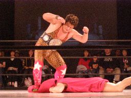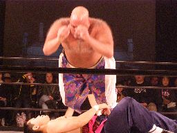 たらこマンダイビングヘッドバット(左写真)、カウント2。