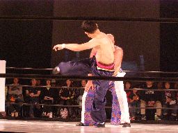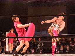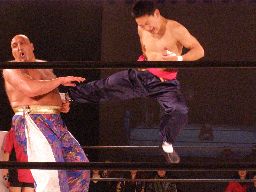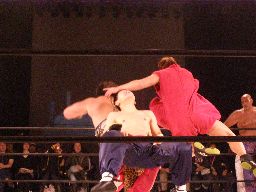 星誕期ロープに振る、趙雲ショルダースルーをかわして(右写真)着地、ソバット、ドロップキック。両軍タッチ。
