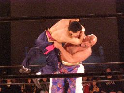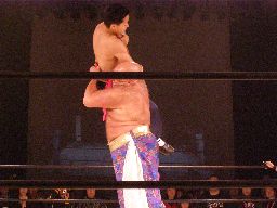 先発は星誕期と趙雲。ロックアップ、星誕期突き飛ばす。坂井「相撲だったら今ので負けだからな!」そりゃそうだ。再度ロックアップ、星誕期また突き飛ばす。坂井「2敗目!」趙雲が足をすくおうとするが星誕期は上からパンチ(左写真)。