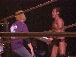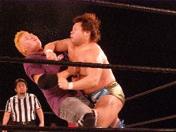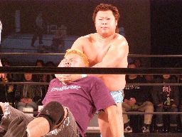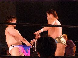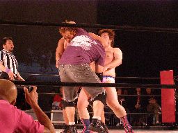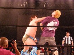 松永張り手、逆水平(右写真)、マイケルにタッチ。マイケルエルボー2発、カバー、カウント2。ディーノようやくコーナーに着き「半田君!3で負けだからね!」とアドバイス。マイケルコーナーに振って串刺しエルボー、に行く前にマンモスはふらふらと自軍コーナーに戻ってディーノとタッチ。