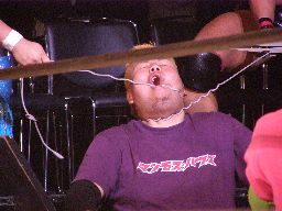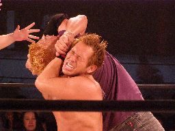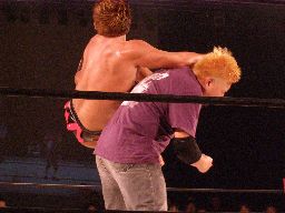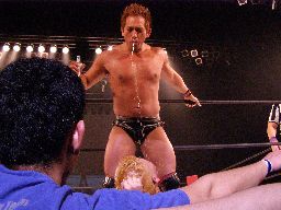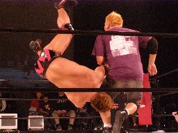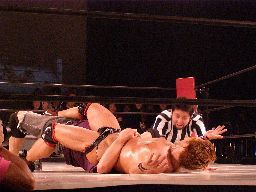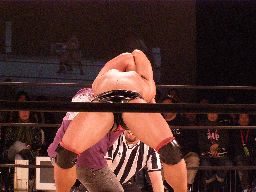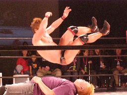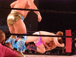 マイケルストンピング、首投げからエルボードロップ行こうとするがマンモスふらりと立ち上がる。マイケルは再度首投げからストンピング、そしてエルボードロップ(右写真)、カウント2。