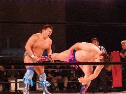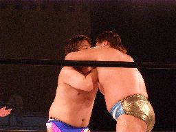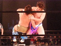 松永が入ってネッククラッチ(右写真)、リリースして場外に出す。