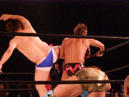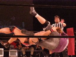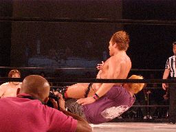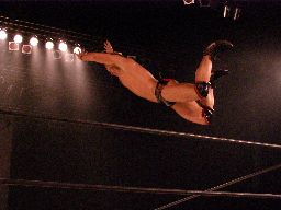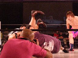 そしてナイトメア(右写真)、マイケルがカットに入るがいつものように松永の顔に座るのではなくマイケルにジャンピングビッグブーツ。なぜかいつもマイケルにはキツいディーノ。5分経過。