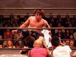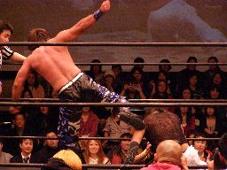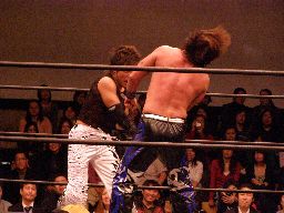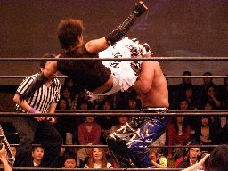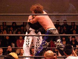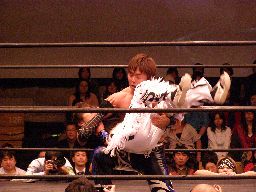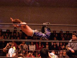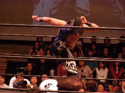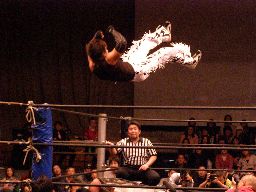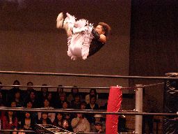 MIKAMI背中を向けてラダーに上る。そこからまさかのスーサイドボム!(右写真)しかしHARASHIMAは2で返す。この技見たの3回目かな。