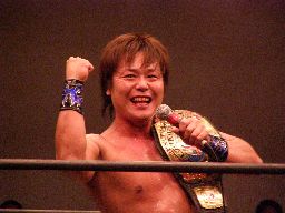 HARASHIMA雄叫び(右写真)。マイクを取ると「MIKAMI、つえーっ!やっぱレジェンドだー!でもそんな強いMIKAMIにだって、俺は負けないぞ!ほんとにレジェンドだったよ。次、誰の挑戦でもまたまた受けてやるよ。次の後楽園は12月30日だー!」