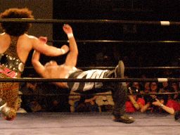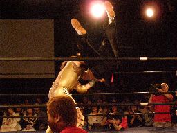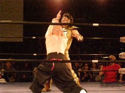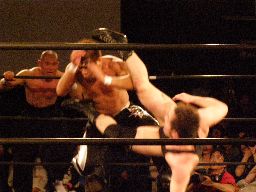 ここで会場が暗転、望月がリングに。「目標」の望月との一騎打ちが実現。望月アントンを蹴りまくる(左写真)。