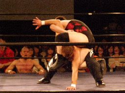 坂井は望月を場外に落としアントンを呼び込む。アントン手刀。「リッキー!」と叫んでバックハンドチョップ。「ダスティ!」と叫んでエルボースタッブ。アントンが羽交い絞め、坂井も「ダスティ!」と叫んでエルボースタッブ(右写真)。