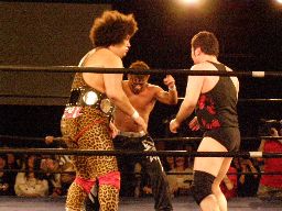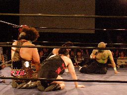 先発はアントン、岩佐、ポイズン。3人ロックアップ(左写真)、すぐにブレーク。
