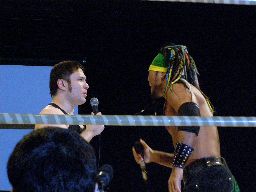 京平が止めに入ると(左写真)「マイクを置いたら真っ向勝負だ!」と叫ぶ。いよいよ試合か、と思わせておいて2人は東郷と近藤にタッチ。