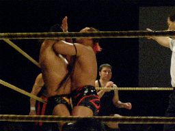 手四つからの力比べは近藤が優勢(右写真)。東郷ガットショット、腕をひねる。近藤ボディにパンチ入れて切り返す。東郷ホイップ、足すくってのフォール合戦、ブレーク。サスクと大鷲にタッチ。