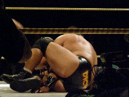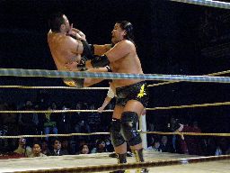 近藤のラリアットかわしアントンは卍固め(右写真)、近藤は力で外す。