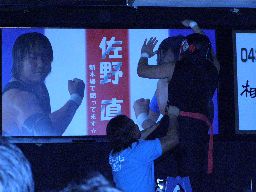看板を外そうとするサスケ、佐野が阻止(右写真)。ラダーが倒れてサスケ落下。