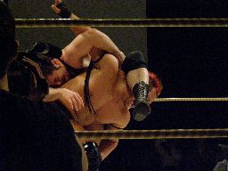 大鷲が入ってブレーンバスターからギロチンドロップ、カウント2。YASSHIエルボースマッシュ連打、3発目をアントンかわして逆さ押さえ込みに(右写真)、カウント2。