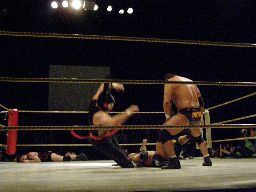 近藤がアントンを肩車に担ぎ上げYASSHIが回転式ネックブリーカードロップに(右写真)、近藤がカバー、カウント2。