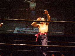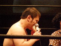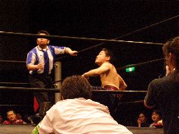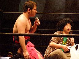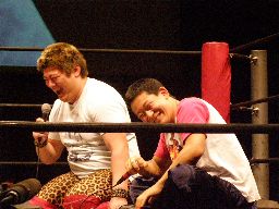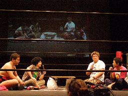 リング上はちゃぶ台をはさんでこんな感じ(右写真)。坂井が趙雲に近況を聞く。この3連戦が終わっても明日昼にFuture Star、夜にNEOの北沢大会があるので北沢5連戦という売れっ子っぷりだそうだ。