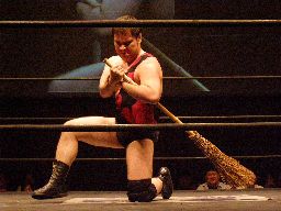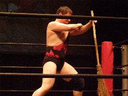 アントン飛行機投げで切り返してグラウンドヘッドロックに。両者立ち上がる(左写真)。ほうきアントンの髪を引っ張る。アントンは松井レフェリーのブラインドを突いてナックル。ロープワークからアントンがエルボードロップ、ほうきがかわしたところでゴング。