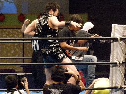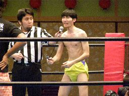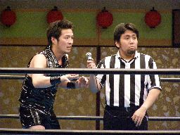 亜門「いいじゃん!やろうよ!お前ら勝てるよ。ルールは5対5のシングルで、先に3勝した方の勝ちとしましょう。早速控室の方で着替えてもらっていいですかね?」大日本勢退場。