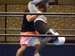 726マウント取って「おら童貞、やり返してみろよ!この童貞!」とイジメのような攻撃(右写真)。ボディスラムからカバー、カウント2。