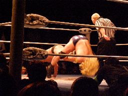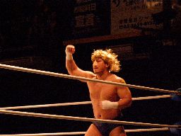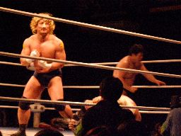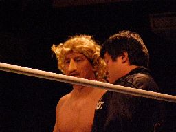 「メインイベント」とされたこの試合、木原リングアナが「らおコーナ〜」「らかコーナ〜」と仲田龍風のコール。まず「スピニング・トー・ホールド」に乗ってテリー三四郎入場(右写真)。テリーはブロンドじゃねえよなあ。