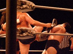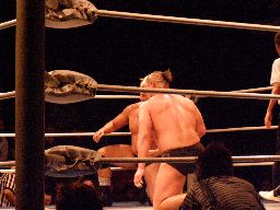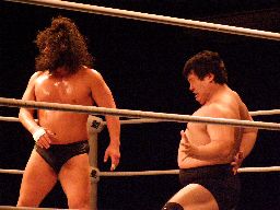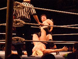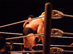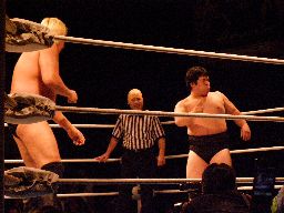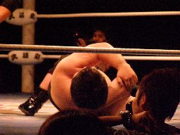ロープに振ってビッグブーツ(左写真)、テリー三四郎場外転落。ジャンボがリングイン。5分経過。