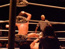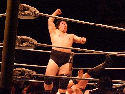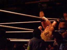 ミノディ首投げからギロチンドロップ(右写真)、ジョー和田の超スローカウントは2。