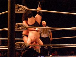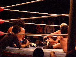ミノディパイルドライバー(右写真)、当然ゴッチ式などではなく足を伸ばしてゆっくり落とすブロディ風ドリルアホール式。10分経過。