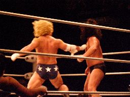 ミノディロープに振ってドロップキック、このフォームもそっくり。ミノディはハンセンにタッチ、場外に降りてテリー三四郎を絞首刑(右写真)。
