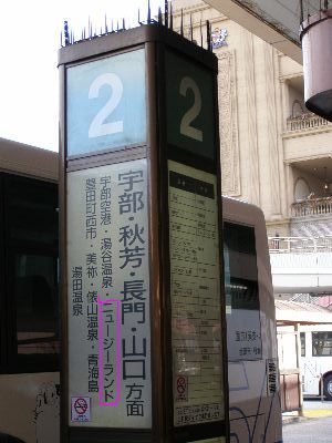 2日目、朝食はホテルでバイキング。10時に出てまた長府に。ニュージーランドにも行けるバス。