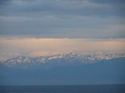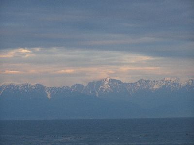 氷見到着。対岸に立山連峰が見える。