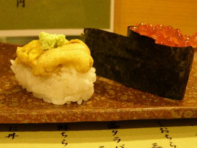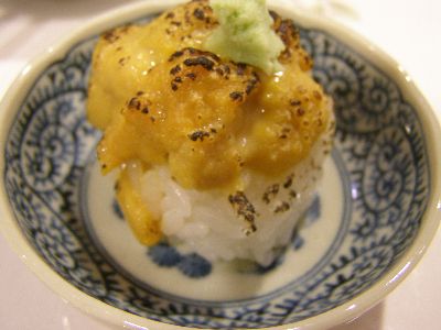 海水うに。軍艦巻きじゃないうには珍しい。ミョウバンに漬けると身がだらっとするので海苔で支えなきゃいけないが、海水に入れて運んだうには身がしっかりしてるからこういうことが可能だそうだ。