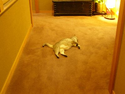 今日の泊まりは浅虫温泉の新し目の宿「さつき」。二階に上ったら廊下で猫がのびのびと寝てた。なでてあげたらその指を両前足でつかんでベロベロなめるサービス。さらに部屋まで着いてくるサービスもあったようだがそれは丁重にお断りした。