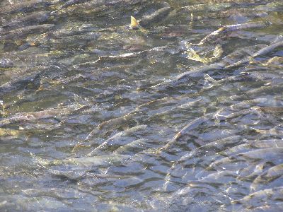 まずは鮭が登ってくるのを目の前で見られる川。幅10mもないどこにでもありそうな川だが、このちょっと上に鮭捕獲用の堰があるためうじゃうじゃといた。