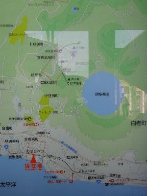 駅の案内板。倶多楽湖はカルデラ湖のためほんとに真ん丸。