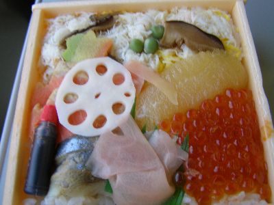 昼食は駅弁「蝦夷ちらし」。「限定品」という話だが、それほどのものではなかった。