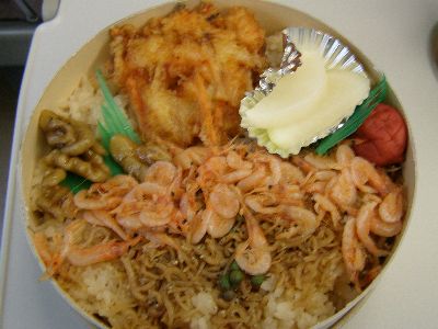 東京8時16分発ののぞみでまず新大阪に。朝食は小田原駅のものらしい(東京駅で購入)「桜えびとじゃこの海物語」。人気駅弁「じゃこめし」に桜えびまで加えた豪華版。最近人気の「一品もの」にさらに手を加えた駅弁が多いような。新大阪で在来線に乗り換えて大阪駅に行くが、駅構内でまた迷う。何回来ても迷うなこの駅は。