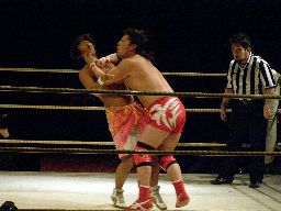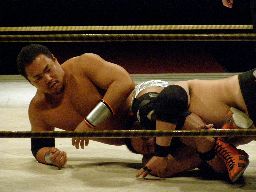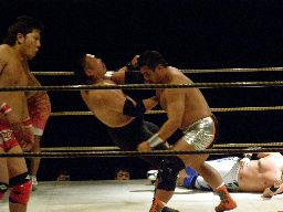 根本ストンピング、ヘッドバット(左写真)2発からブレーンバスター。ロープに振ってエルボー。小杉にタッチ。