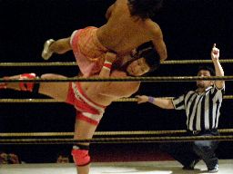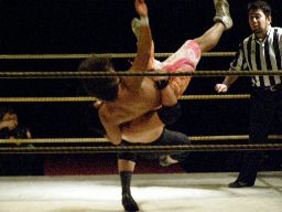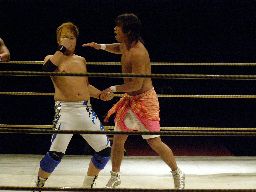 726コーナーに振る、柴山切り返す、726は突進をかわしてジャンピングハイキック(左写真)、コーナーに飛び乗ってローリングセントーン、カウント2。