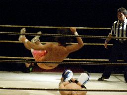 根本ボディスラム、小杉がコーナーからダイビングエルボードロップ(右写真)、柴山も小杉もモチーフは小島なんかな?カウント2。