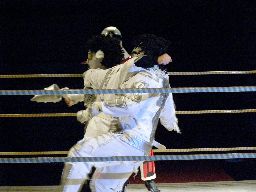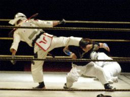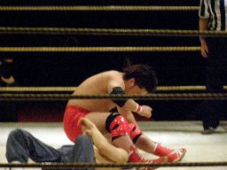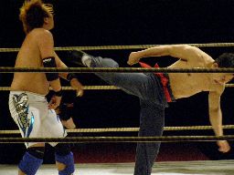 趙雲腕取ってアームロックに、小杉ロープ。趙雲トラースキック(右写真)。