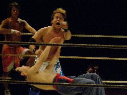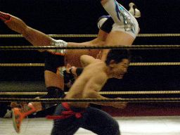 小杉は前にもDDT出たことあるような。腕の取り合いからロープワーク、小杉がショルダーブロック。小杉ロープに飛ぶ、趙雲リープフロッグでかわしてドロップキック行くが小杉も飛んで相打ちに(右写真)。趙雲キック、パンチ。小杉のエルボーをかわして正拳で倒すとフットスタンプ、726にタッチ。