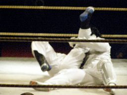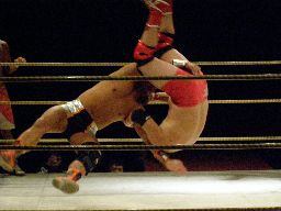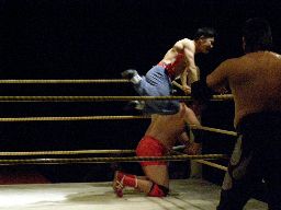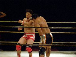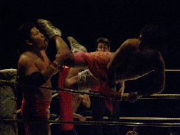 Lite首投げ、エプロンに出てトップロープ越しのセントーン(右写真)、カウント2。
