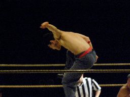 健心場外に出ると足を鉄柱攻撃。リングに戻ってストンピング、726にタッチ。726コーナーでキック、逆水平。趙雲にタッチ。趙雲逆水平、ボディスラムからサマーソルトドロップ(左写真)。